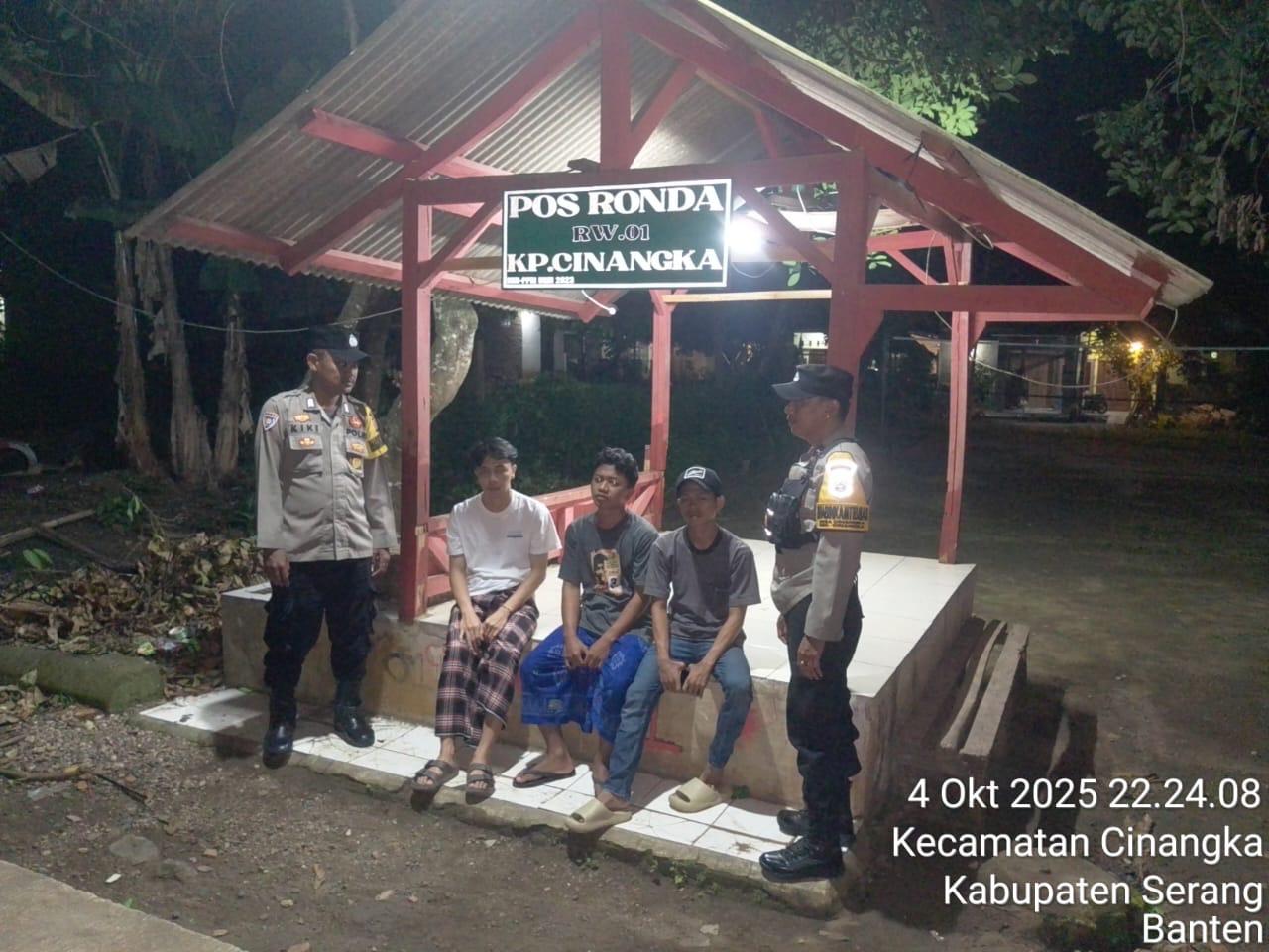 *Polres Cilegon* || Personil Bhabinkamtibmas Polsek Cinangka melaksanakan Program Komandan Wish Kapolda Banten RONDA SATKAMLING menyampaikan komunikasi dengan Petugas Siskamling agar berperan aktif dalam menciptakan Harkamtibmas yang aman dan Kondusif, Minggu (05/10/2025).