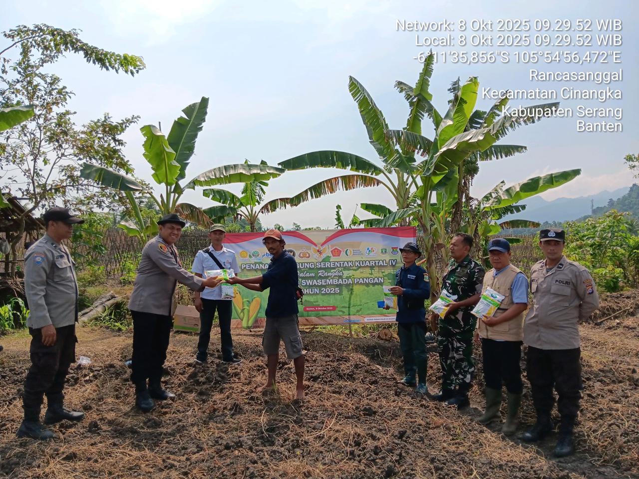 -POLRES CILEGON- Polda Banten.Mendukung program ketahanan pangan nasional, Polres Cilegon,Polsek Cinangka bersama Ketua Kelompok Tani melaksanakan penanaman jagung serentak di Desa Rancasanggal Kecamatan Cinangka Kab Serang. Rabu (10-08-2025)