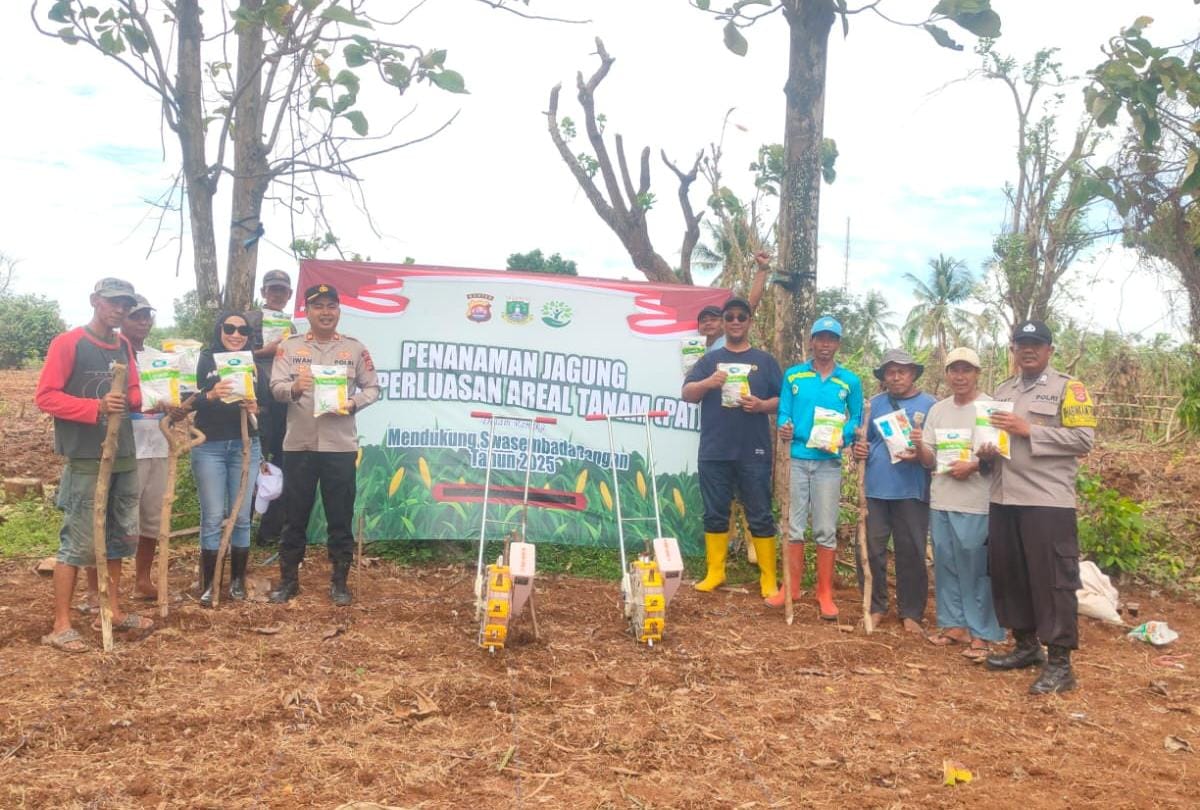 Kapolres Cilegon AKBP AKBP Dr. Martua Raja Taripar Laut Silitonga Melalui Kapolsek Anyar Polres Cilegon IPTU Iwan Sofiyan di Kp. Cikoneng Desa Cikoneng Kecamatan Anyar Kab Serang Dilaksanakan dan mengikuti Kegiatan Penanaman Jagung yang dilaksanakan Oleh Desa Cikoneng Pada perluasan Area Tanam dalam Rangka Mendukung Swasembada Pangan 2025 Serta Implementasi Program Prioritas Asta Cinta Presiden Republik Indonesia