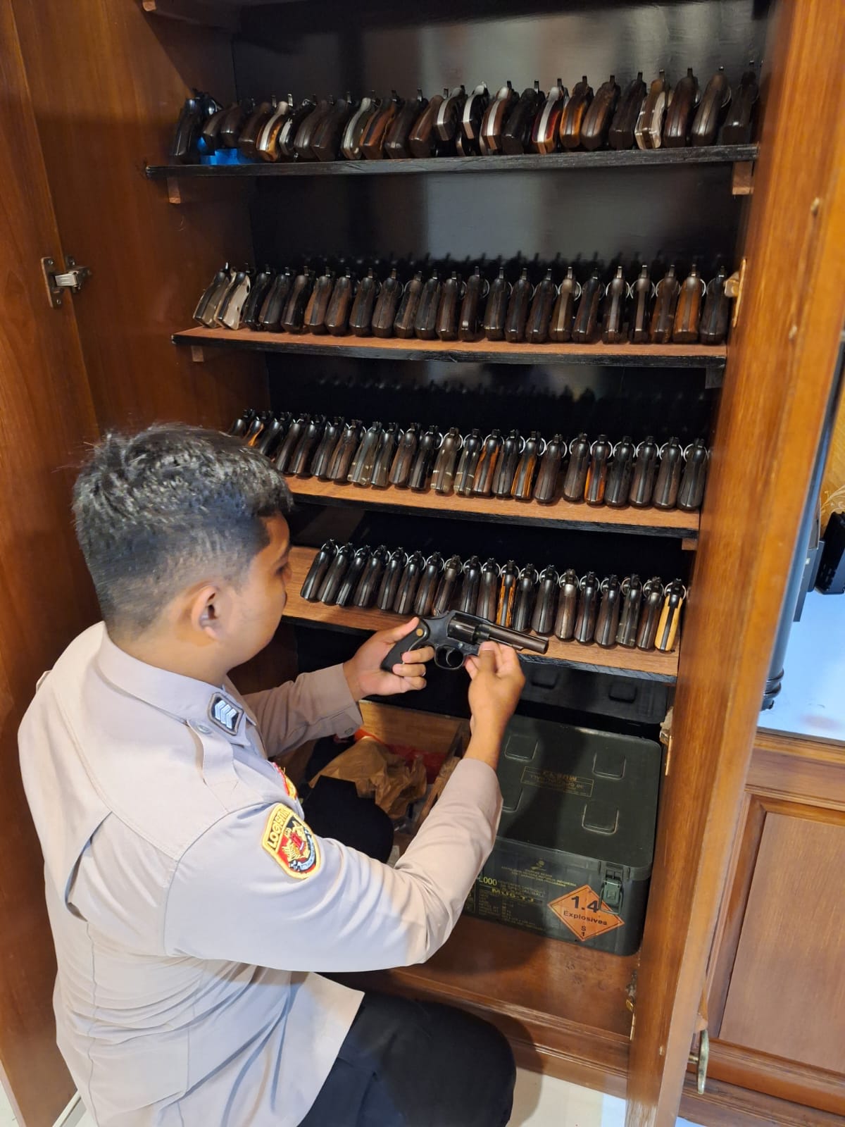 Mengigatkan kepada anggota staff Logistik agar dalam penyimpanan senjata api harus sesuai SOP yang ada dan selalu mengedepatkan keamanan dalam menyimpan senjata api,Dimana harus ada APAR di dalam nya dan suhu ruangan harus terjaga dengan baik mengingat ada Amunisi dan Senjata Api didalam nya.