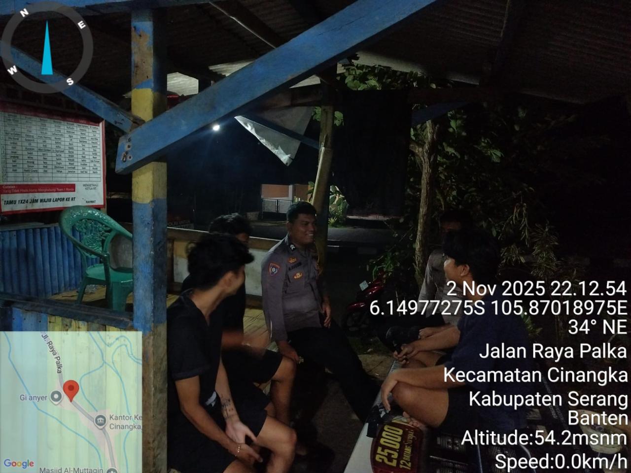 Polres Cilegon || Personel Bhabinkamtibmas Polsek Cinangka melaksanakan Program Commander Wish Kapolda Banten RONDA SATKAMLING menjalin komunikasi dengan Petugas Siskamling agar berperan aktif dalam menciptakan Harkamtibmas yang aman dan Kondusif, Senin (03/11/2025).