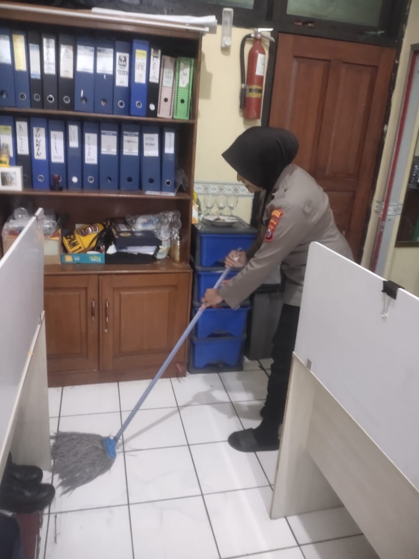 Anggota Bag SDM Polres Cilegon, selalu aktif melakukan kegiatan memmbersihkan ruangan kerja.