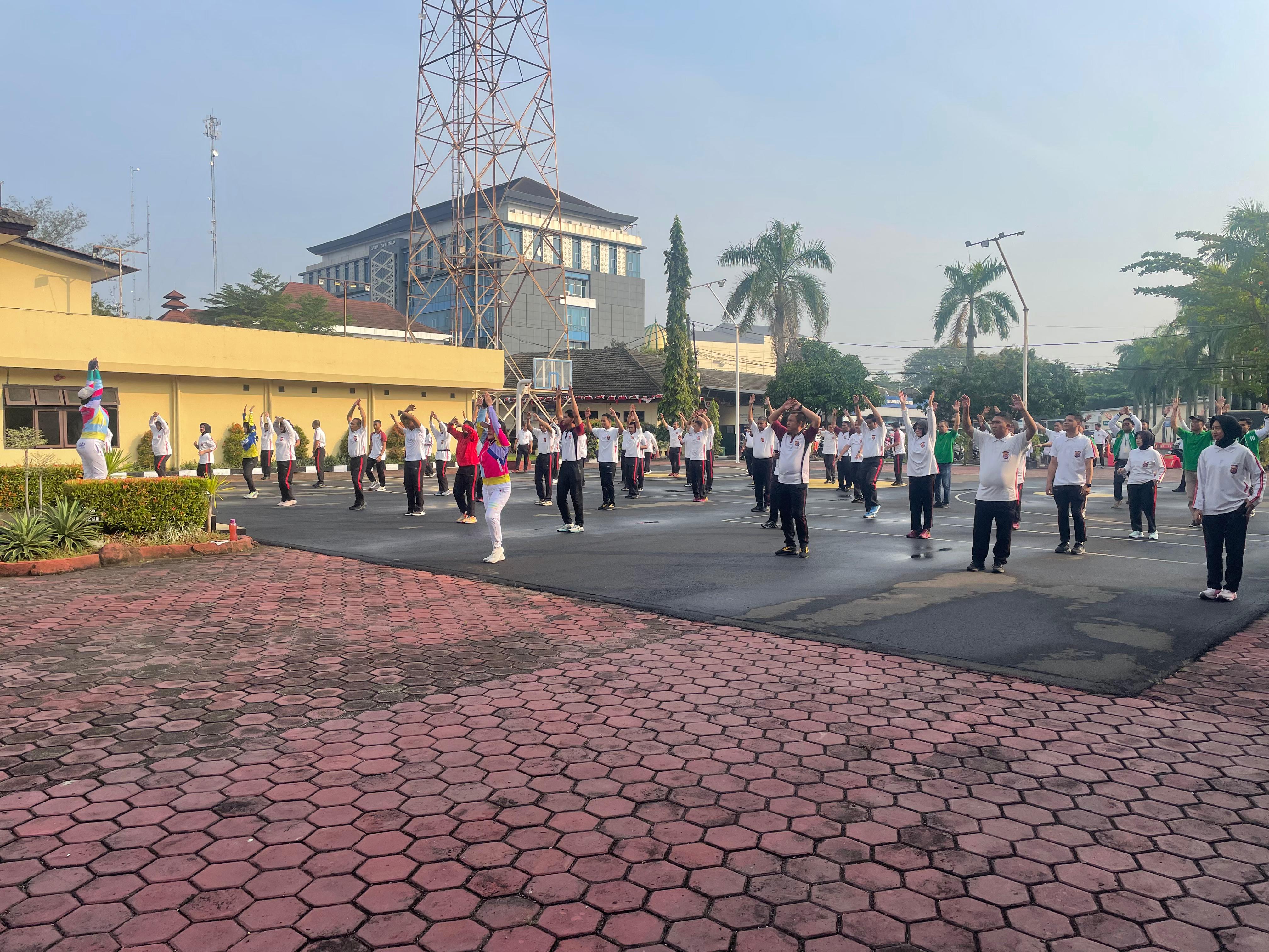 Polwan Polres Cilegon melaksanakan senam untuk meningkatkan kesehatan dan kebugaran fisik, serta meningkatkan konsentrasi.