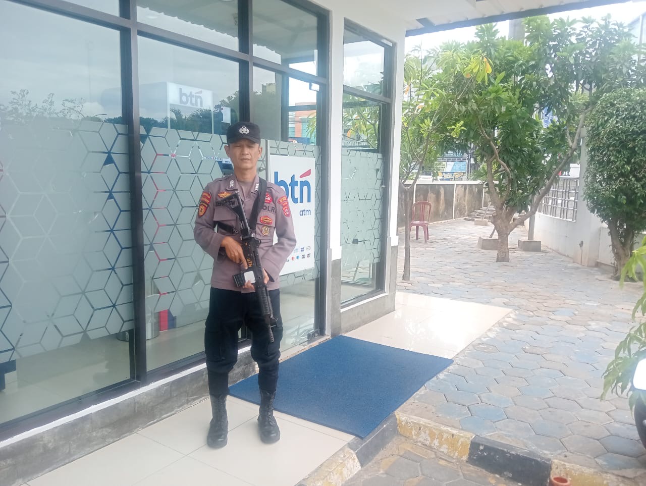Anggota satpamobvit cek situasi disekitar bank