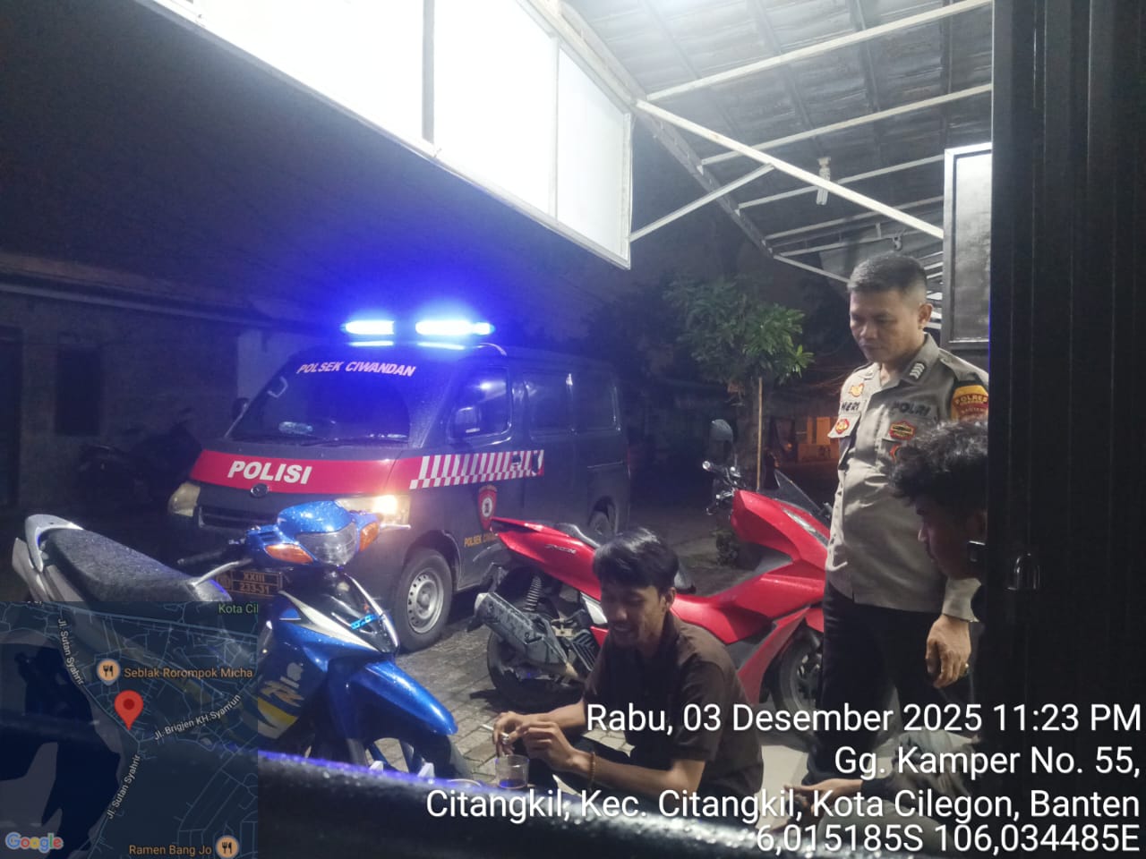 Cilegon - Personil Polsek Ciwandan Polres Cilegon Polda Banten memberikan himbauan kamtibmas dan motivasi kepada anak-anak Remaja Yang sedang Nongkrong Dipinggir Jalan Lingkungan Binaan, Kamis (04/12/2025).