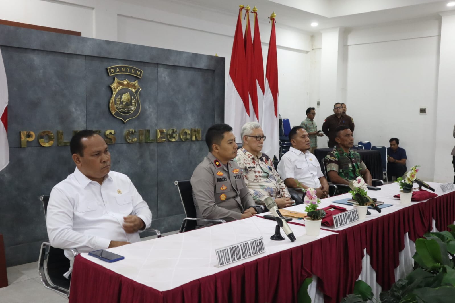 Rapat koordinasi dilaksanakan di bawah penanggung jawab Kapolres Cilegon AKBP Dr. Martua Raja Taripar Laut Silitonga, S.H., S.I.K., M.Si. Kegiatan turut dihadiri Wakapolres Cilegon KOMPOL M. Ridzky Salatun, S.I.K., Wakil Ketua I DPRD Kota Cilegon H. Sohidin, S.H., Wakil Ketua II DPRD Kota Cilegon H. Masduki, Asda II Kota Cilegon H. Dana Sujaksani, S.Sos., M.Si., Danramil Cilegon Mayor Inf Usman, Plt Kadis Ketahanan Pangan Kota Cilegon Novi Yogi, Sekjen MUI Kota Cilegon H. Sutisna Abas, Ketua MUI Kabupaten Serang H. Muhit, Ketua FKUB Kabupaten Serang KH. Komarudin, Head Operation ASDP Merak I Putu Widhiyatamaja, Jr Officer Sc PT Pertamina Tanjung Gerem Achtizen, para PJU Polres Cilegon, Kapolsek jajaran Polres Cilegon, perwakilan SKPD Kota Cilegon, pimpinan instansi terkait, serta pimpinan organisasi keagamaan.
