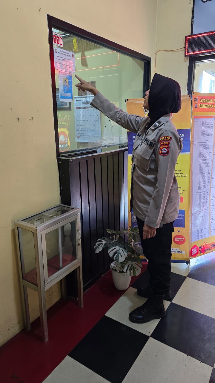 Polwan Polres Cilegon Aipda Emi Prasetyo Selaku Personil siwas Polres Cilegon Melakukan pengechekan dan monitoring pada pelayanan Izin Kermaian pada sat Intel Polres Cilegon.