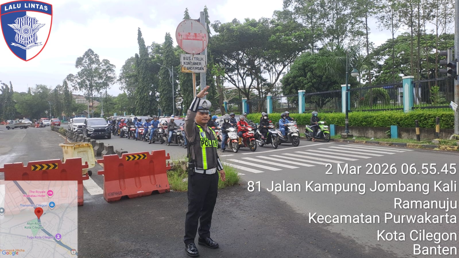 Cilegon – Polres Cilegon Polda Banten, Dalam Mewujudkan Aksi Nyata Pelayanan Kepada Masyarakat, Personil Satlantas Polres Cilegon Polda Banten Laksanakan PECAK (Pergelaran Cepat Anggota Kepolisian) Pengaturan Lalu lintas di wilayah perkotaaan terutama di titik rawan kemacetan dan kecelakaan lalu lintas, Senin (02/03/2026).