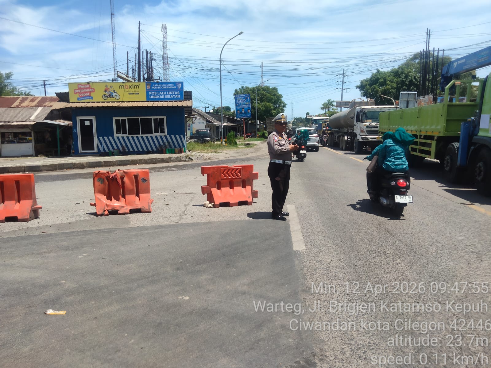 Cilegon - Personil Unit Lantas Polsek Ciwandan Polres Cilegon Polda Banten melaksanakan kegiatan monitoring jalur wisata di depan Pos Lantas JLS Ciwandan, Minggu (12/04/2026).