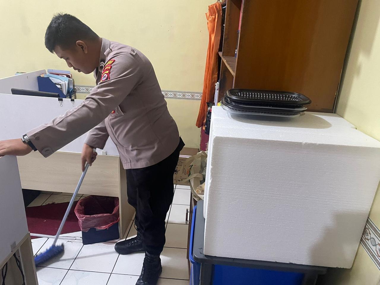 anggota SDM Polres Cilegon, aktif dalam selalu menjaga kebersian ruangan keerja setiap saat.