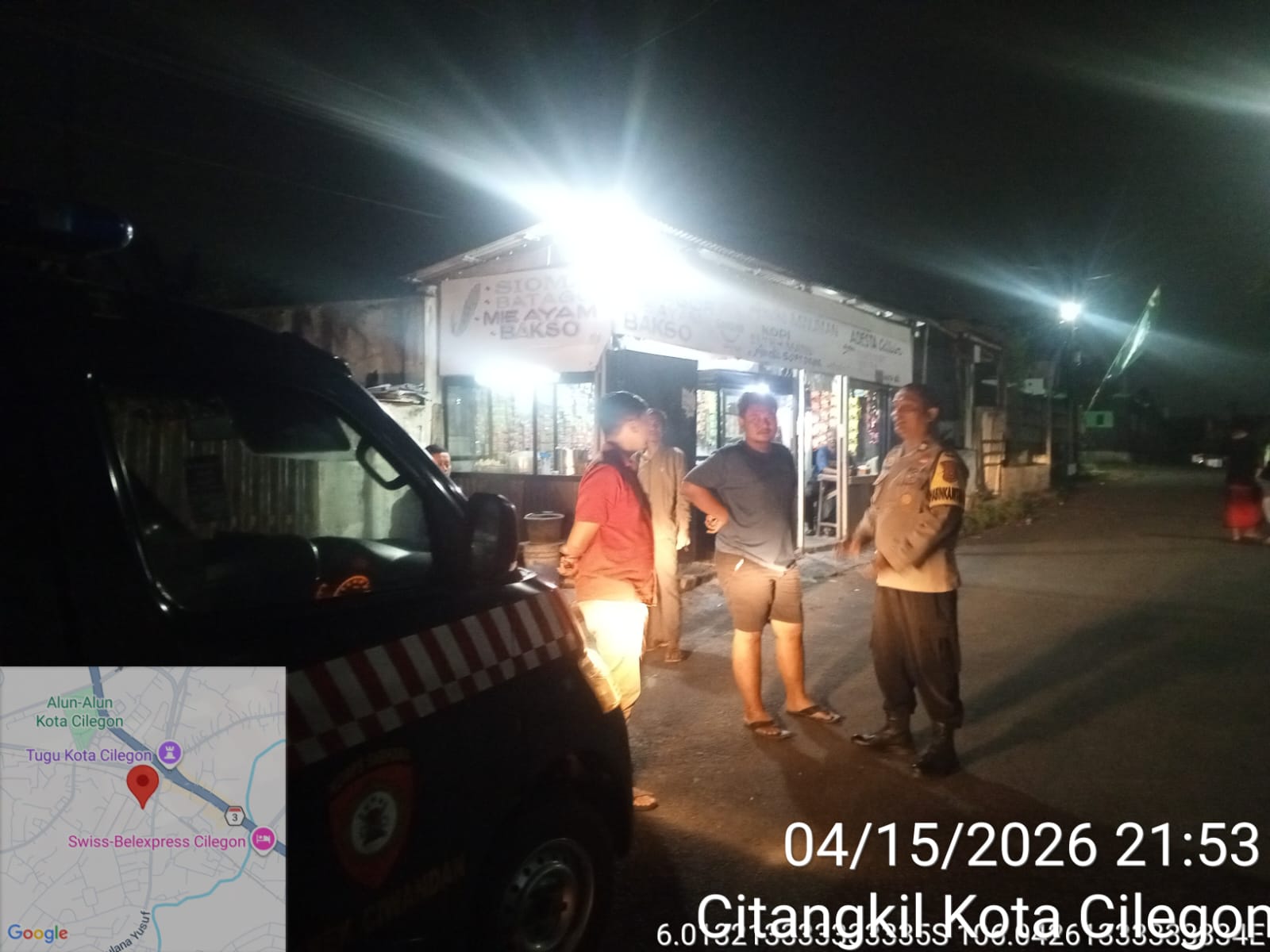 Cilegon - Personil Polsek Ciwandan Polres Cilegon Polda Banten Dalam Pelaksanaan Kegiatan Patroli dengan menyalakan lampu rotator berwarna biru di Daerah Hukum Polsek Ciwandan Polres Cilegon Polda Banten dari malam hingga dini hari, dalam rangka menciptakan situasi aman dan kondusif, Kamis (16/04/2026).